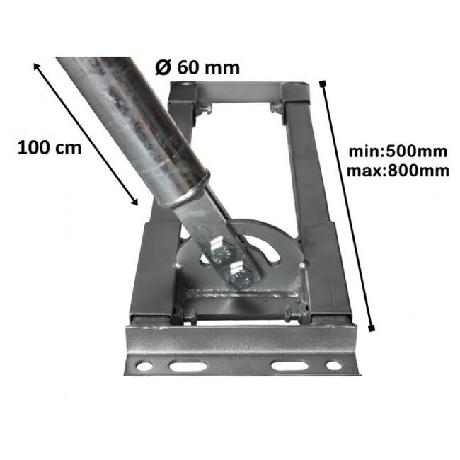 Slanted roof mounting with adjustable mounting points from 50 cm to 80 cm width. The tube for mounting has a diameter of 60 mm. Nicely finished with optional plastic roof tile and/or funnel. Read more.